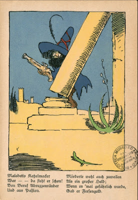 [Maledetto Katzelmacher riceve denaro per scopi sordidi, in ambienti che non sono da meno. Si noti la scritta "Vietato di lordare", visibile ancora oggi identica in un portico di Trento. All'epoca la città era territorio austriaco, cosa che conferisce a Katzelmacher la natura di autentica serpe in seno. Il trattamento draconiano riservato a quelli come lui gli consiglia in ogni caso la prudenza, per cui si accontenta di sistemarsi con un fornello da caldarrostaio presso un'abitazione che si identifica come "Casa della Triplice", di Michl, Seppl & C. s.r.l.